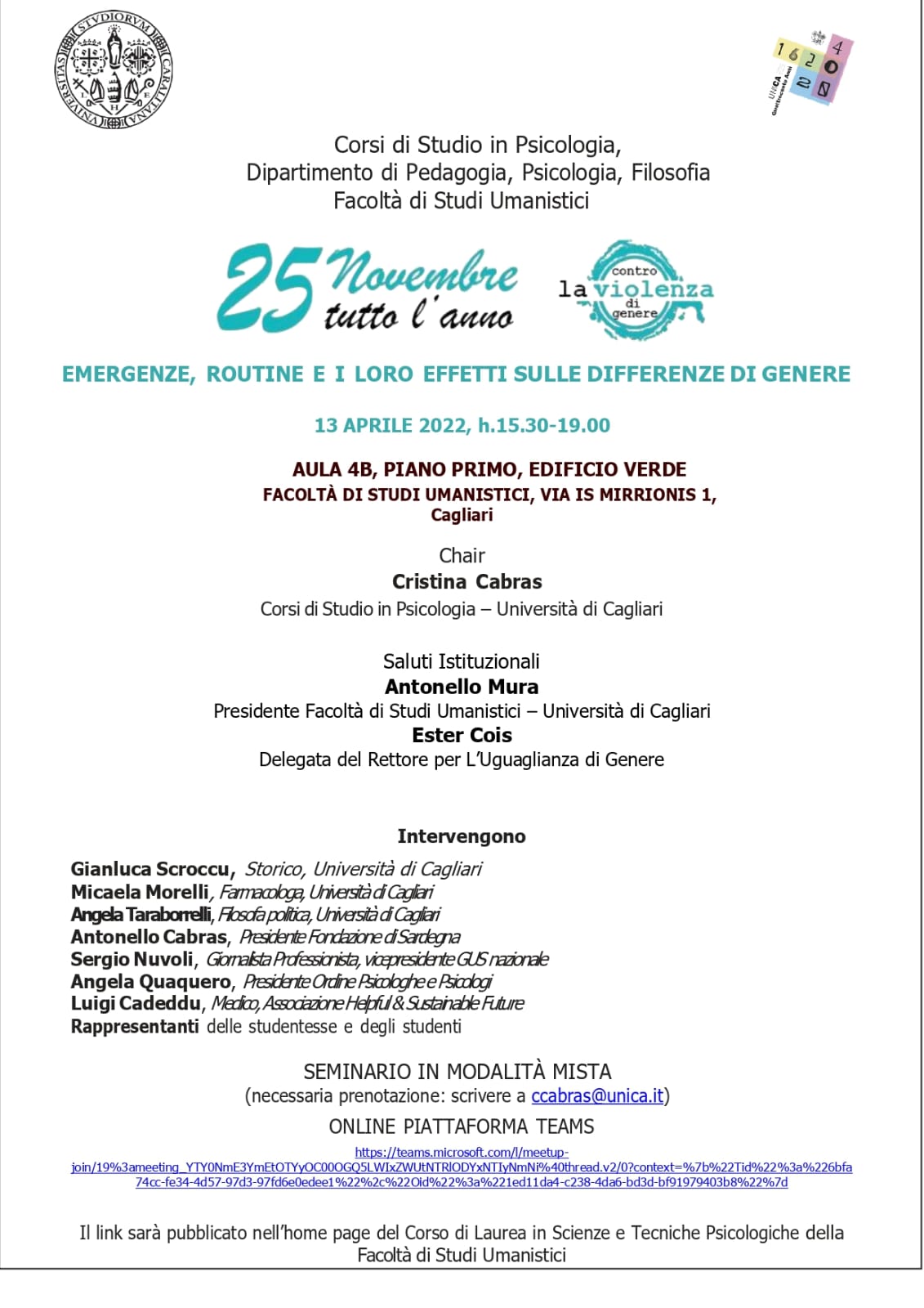L'incontro, coordinato da Cristina Cabras, sarà aperto dai saluti di Antonello Mura, presidente della Facoltà di Studi Umanistici, e dall'intervento di Ester Cois, delegata del Rettore per l'uguaglianza di genere. Al seminario parteciperanno Gianluca Scroccu (docente di Storia contemporanea), Micaela Morelli (docente di Farmacologia), Angela Taraborrelli (docente di Filosofia politica), Antonello Cabras (presidente della Fondazione di Sardegna), Sergio Nuvoli (giornalista e vicepresidente GUS nazionale), Angela Quaquero (presidente dell'Ordine delle psicologhe e degli psicologi della Sardegna), Luigi Cadeddu (medico dell'associazione Helpful&Sustainable Future) e i rappresentanti delle studentesse e degli studenti.