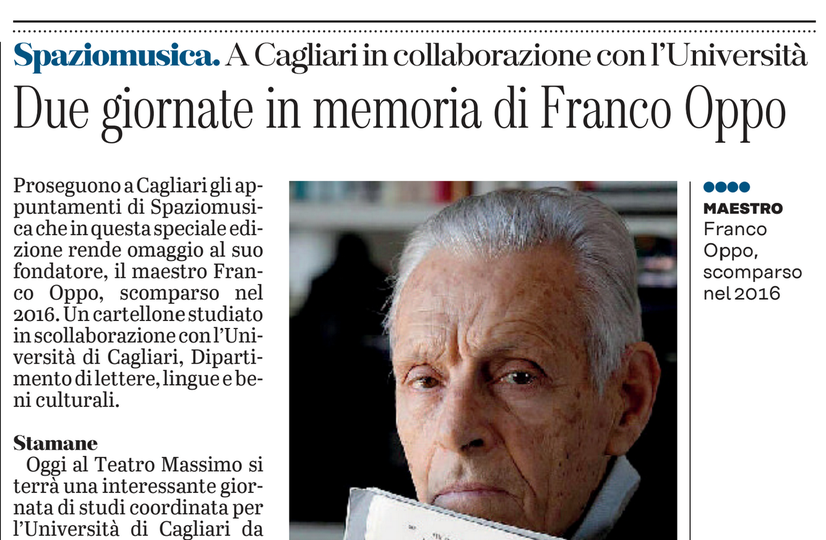 Cagliari, 11 novembre 2021 – Sarà un’iniziativa articolata a complessa a fare il punto sull’opera di Franco Oppo, il compositore italiano d’avanguardia scomparso nel 2016, che fu ospite di importanti festival internazionali (Dardmstadt, Venezia, Varsavia), ed è stato e viene eseguito da musicisti di primordine (Krzysztof Okon, Irvine Arditti, Andrzej Markowski fra gli altri).