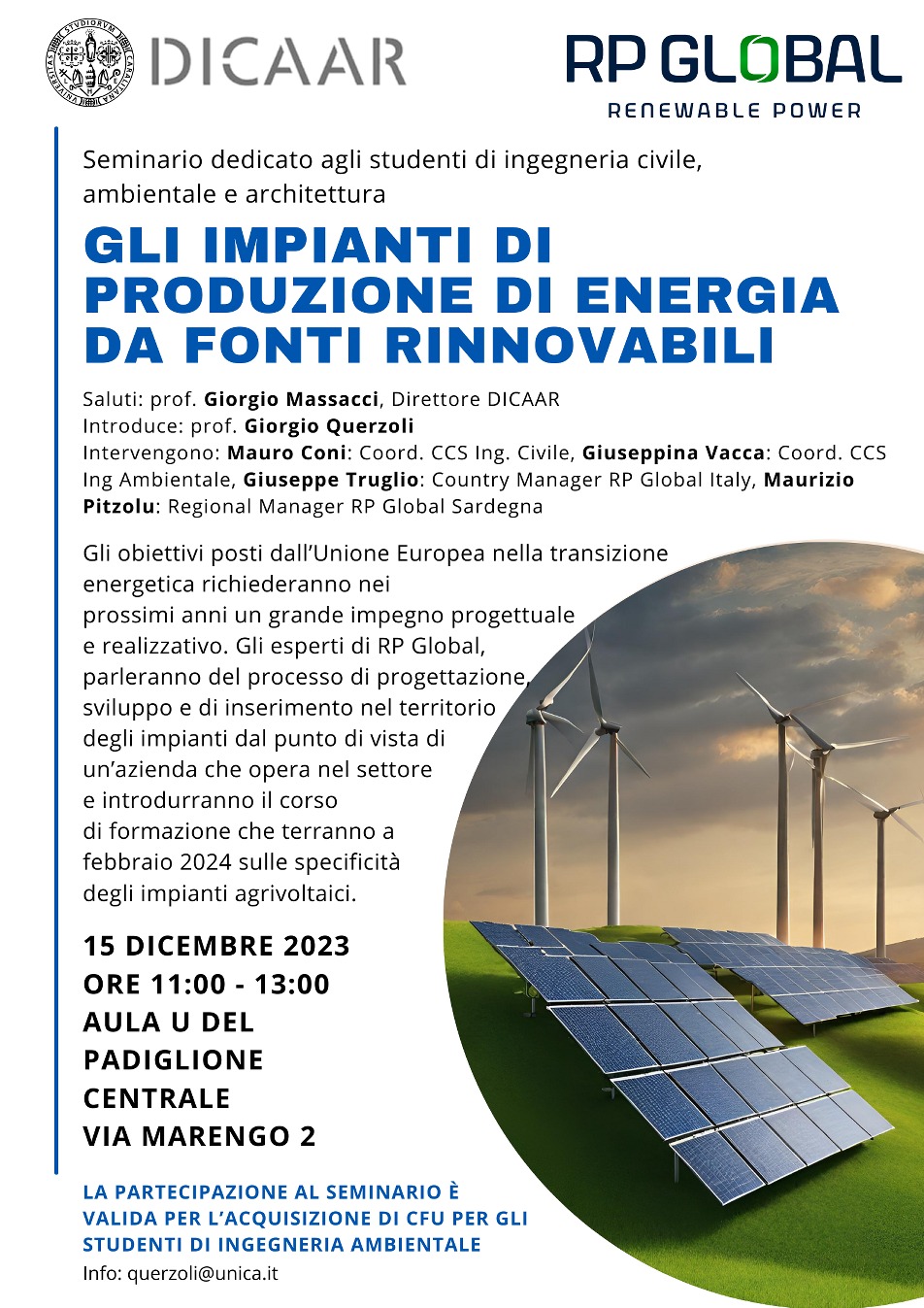 Il prossimo venerdì 15 dicembre, presso l'aula U, si svolgerà un seminario intitolato "Gli impianti di produzione di energia da fonti rinnovabili", riservato agli studenti di ingegneria civile, ambientale e architettura, dalle 11:00 alle 13:00.