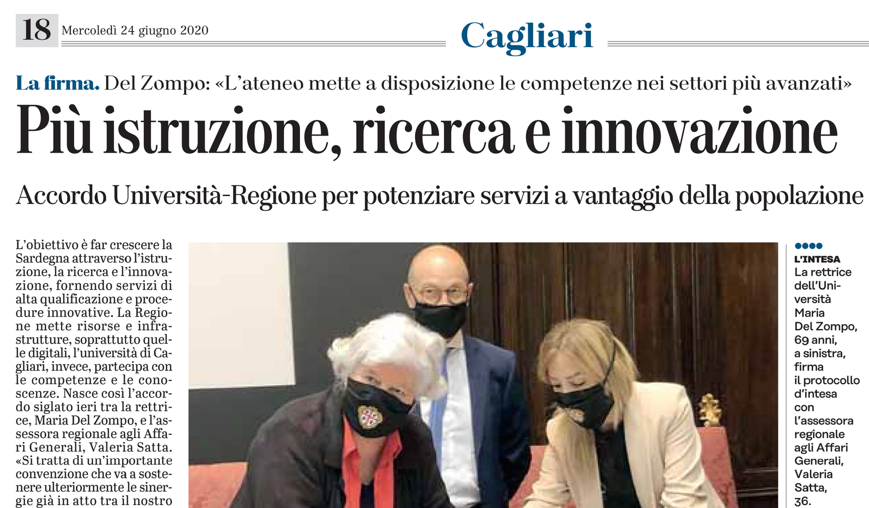 Cagliari, 23 giugno 2020 - E’ stato firmato questa mattina dal Rettore Maria Del Zompo e dall’assessore agli Affari generali, Personale e Riforma, Valeria Satta, un protocollo di intesa tra l’Università degli Studi di Cagliari e la Regione Autonoma della Sardegna in materia di istruzione, ricerca, innovazione e sviluppo del territorio. Alla firma dell’importante intesa era presente il professor Gianni Fenu, delegato di Ateneo per l’ICT.