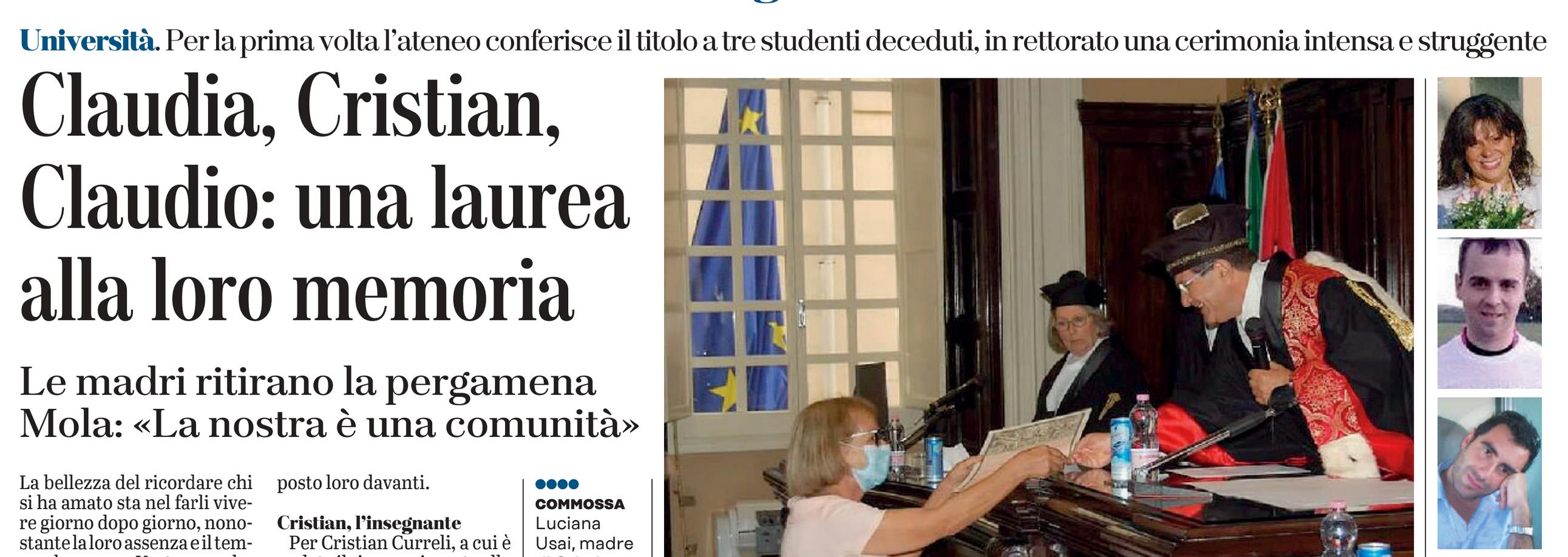 Si tratta di Claudia Chessa, alla quale è stata attribuita la laurea alla memoria in Scienze della comunicazione, di Cristian Curreli, a cui è stato attribuito un riconoscimento alla memoria degli studi compiuti nel corso di laurea in Scienze della Formazione primaria dopo la laurea conseguita in Scienze dell’educazione, e di Claudio Deiana, al quale l’Ateneo ha conferito la laurea alla memoria in Giurisprudenza. Sono state le mamme della studentessa e dei due studenti a ritirare la pergamena dalle mani del Magnifico, che dopo la cerimonia ha ricevuto in forma privata le famiglie.