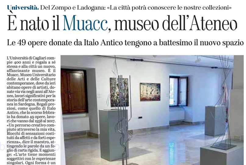 L'Università di Cagliari compie 400 anni e regala a sé stessa e alla città un nuovo, affascinante museo. È il Muacc, Museo Universitario delle Arti e delle Culture contemporanee, dove da ieri abitano opere di artisti, donate via via negli anni all'Ateneo, lavori significativi per la storia dell'arte contemporanea in Sardegna. Regali preziosi, come quello di Italo Antico, che lo scorso febbraio ha donato 49 opere, lavori che vanno dal 1958 al 2017. «Un percorso creativo compiuto attraverso la mia vita. Blocchi di sensazioni costituiti da affetti e da forti esperienza», dice il maestro, attingendo le parole da un foglio di carta rigida. E aggiunge: «L'arte tiene momenti soggettivi con le esperienze singolari. Ogni forma è un volto che ci guarda e - siccome ci guarda - noi dobbiamo imparare a guardarlo».