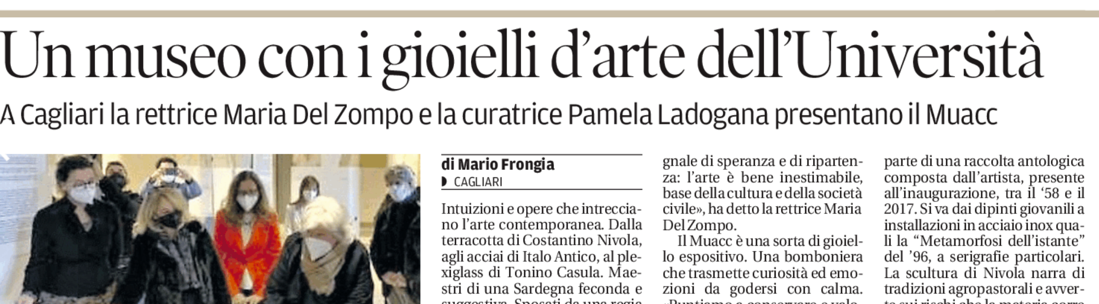 Il Muacc, affidato alla direzione scientifica di Rita Pamela Ladogana, docente di storia dell'arte contemporanea dell'Ateneo, è un figlio della filosofia e del lavoro fatto in questi anni dal Rettore Maria Del Zompo: aprire l'Università alla città, costruendo legami sempre più profondi, di reciproco scambio. «È un bel momento di riconoscimento del valore dell'importanza dell'arte, che è la base della conoscenza, della cultura, della civiltà», dice il Rettore con la gioiosa consapevolezza di chi ha raggiunto un bel risultato. «Abbiamo risistemato un edificio abbandonato - racconta - nel quale metteremo in mostra tutte le donazioni di arte moderna che già abbiamo. Questo spazio si presta però ad altre esposizioni e incontri. Oggi è una ripartenza, un segnale di speranza».