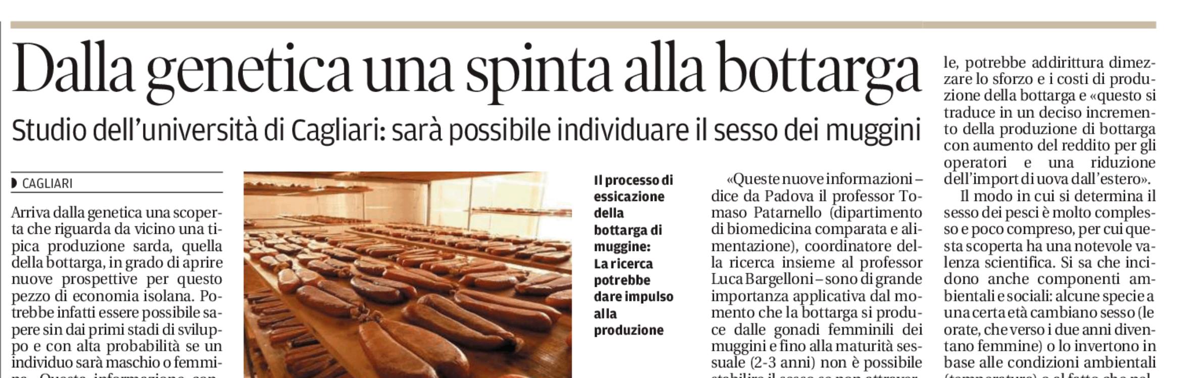 Attraverso il sequenziamento del genoma del muggine, i ricercatori dell'Università di Cagliari, in collaborazione con i colleghi di Padova, dell'Ispra e del “Fisheries Research Institute” greco, hanno identificato dei marcatori genetici (legati al gene Follicle Stimulating Hormone Receptor) attraverso i quali è possibile sapere sin dai primi stadi di sviluppo se un individuo sarà maschio o femmina. «Questa informazione non solo ha una grande valenza scientifica considerato il complesso sistema di determinazione del sesso nei pesci ancora oggi poco compreso - spiega Tommaso Patarnello del dipartimento di Biomedicina e Alimentazione dell'Università di Padova -, ma è anche di grande importanza applicativa dal momento che la bottarga si produce dalle gonadi femminili dei muggini e fino alla maturità sessuale, 2-3 anni, non è possibile stabilire il sesso se non attraverso l'esame istologico della gonade».