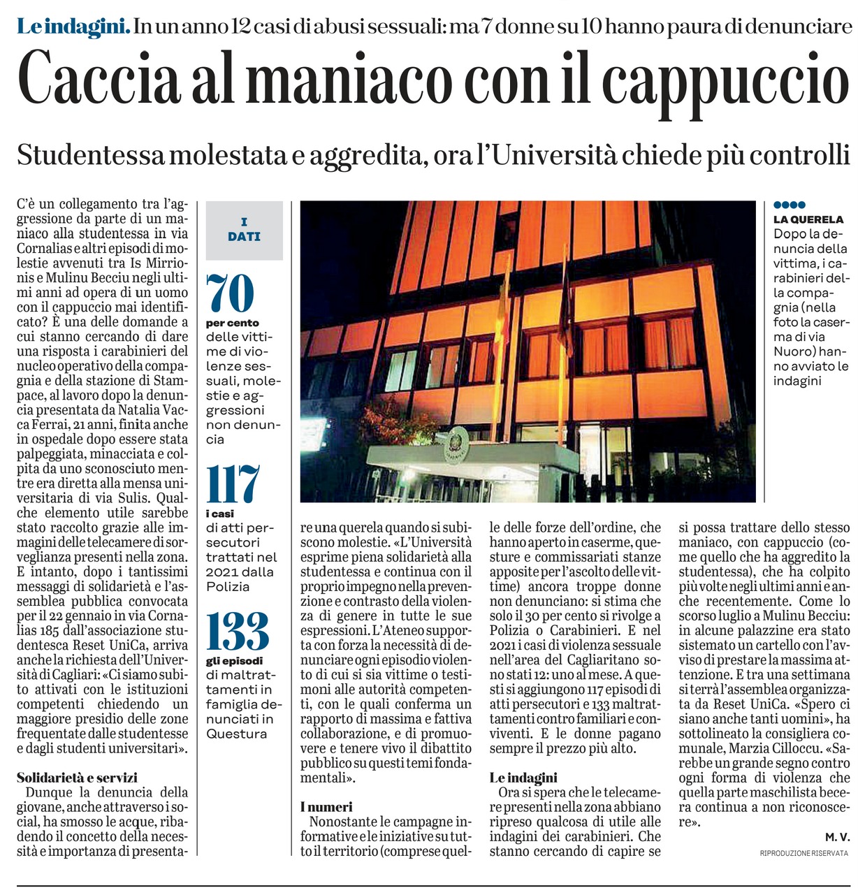 C'è un collegamento tra l'aggressione da parte di un maniaco alla studentessa in via Cornalias e altri episodi di molestie avvenuti tra Is Mirrionis e Mulinu Becciu negli ultimi anni ad opera di un uomo con il cappuccio mai identificato? È una delle domande a cui stanno cercando di dare una risposta i carabinieri del nucleo operativo della compagnia e della stazione di Stampace, al lavoro dopo la denuncia presentata da Natalia Vacca Ferrai, 21 anni, finita anche in ospedale dopo essere stata palpeggiata, minacciata e colpita da uno sconosciuto mentre era diretta alla mensa universitaria di via Sulis. Qualche elemento utile sarebbe stato raccolto grazie alle immagini delle telecamere di sorveglianza presenti nella zona. E intanto, dopo i tantissimi messaggi di solidarietà e l'assemblea pubblica convocata per il 22 gennaio in via Cornalias 185 dall'associazione studentesca Reset UniCa, arriva anche la richiesta dell'Università di Cagliari: «Ci siamo subito attivati con le istituzioni competenti chiedendo un maggiore presidio delle zone frequentate dalle studentesse e dagli studenti universitari». Solidarietà e servizi Dunque la denuncia della giovane, anche attraverso i social, ha smosso le acque, ribadendo il concetto della necessità e importanza di presentare una querela quando si subiscono molestie. «L'Università esprime piena solidarietà alla studentessa e continua con il proprio impegno nella prevenzione e contrasto della violenza di genere in tutte le sue espressioni. L'Ateneo supporta con forza la necessità di denunciare ogni episodio violento di cui si sia vittime o testimoni alle autorità competenti, con le quali conferma un rapporto di massima e fattiva collaborazione, e di promuovere e tenere vivo il dibattito pubblico su questi temi fondamentali». I numeri Nonostante le campagne informative e le iniziative su tutto il territorio (comprese quelle delle forze dell'ordine, che hanno aperto in caserme, questure e commissariati stanze apposite per l'ascolto delle vittime) ancora troppe donne non denunciano: si stima che solo il 30 per cento si rivolge a Polizia o Carabinieri. E nel 2021 i casi di violenza sessuale nell'area del Cagliaritano sono stati 12: uno al mese. A questi si aggiungono 117 episodi di atti persecutori e 133 maltrattamenti contro familiari e conviventi. E le donne pagano sempre il prezzo più alto. Le indagini Ora si spera che le telecamere presenti nella zona abbiano ripreso qualcosa di utile alle indagini dei carabinieri. Che stanno cercando di capire se si possa trattare dello stesso maniaco, con cappuccio (come quello che ha aggredito la studentessa), che ha colpito più volte negli ultimi anni e anche recentemente. Come lo scorso luglio a Mulinu Becciu: in alcune palazzine era stato sistemato un cartello con l'avviso di prestare la massima attenzione. E tra una settimana si terrà l'assemblea organizzata da Reset UniCa. «Spero ci siano anche tanti uomini», ha sottolineato la consigliera comunale, Marzia Cilloccu. «Sarebbe un grande segno contro ogni forma di violenza che quella parte maschilista becera continua a non riconoscere». M. V.