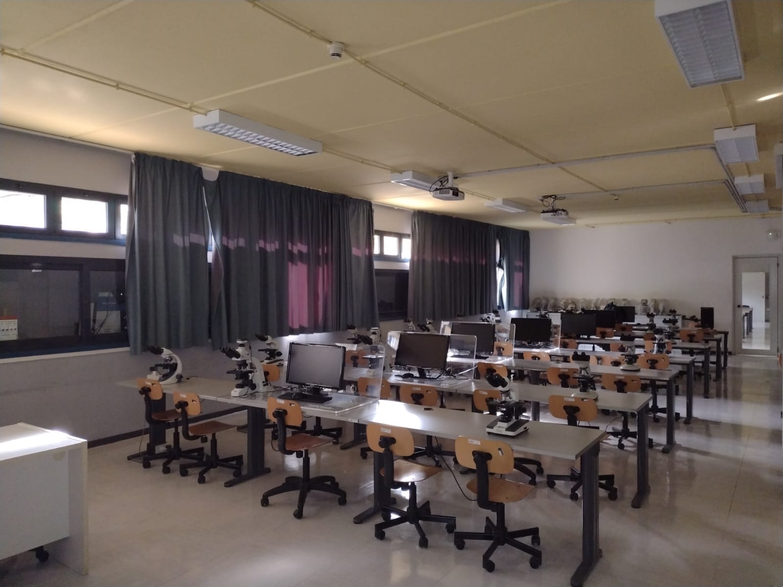N. 40 postazioni con microscopi ottici; 7 fotocamere digitali ad alta risoluzione collegate ai microscopi e ai relativi PC dotati di software per analisi di immagini; 2 proiettori full HD per la proiezione a parete di vetrini dal microscopio docente collegato con telecamera digitale e PC.