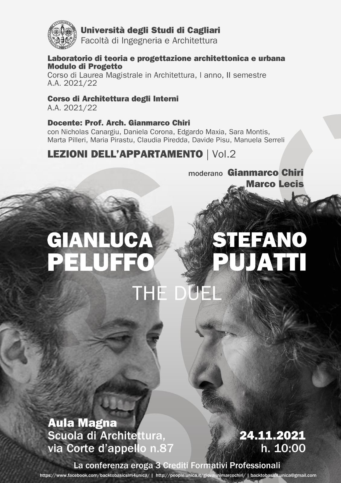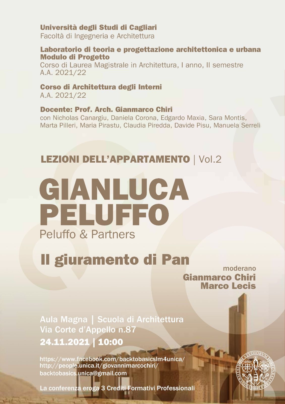 Il 24 novembre alle ore 10:00, nell'Aula Magna della Scuola di Architettura, in via Corte d'Appello, n. 87 (Cagliari) si terranno le conferenze di Stefano Pujatti e Gianluca Peluffo.