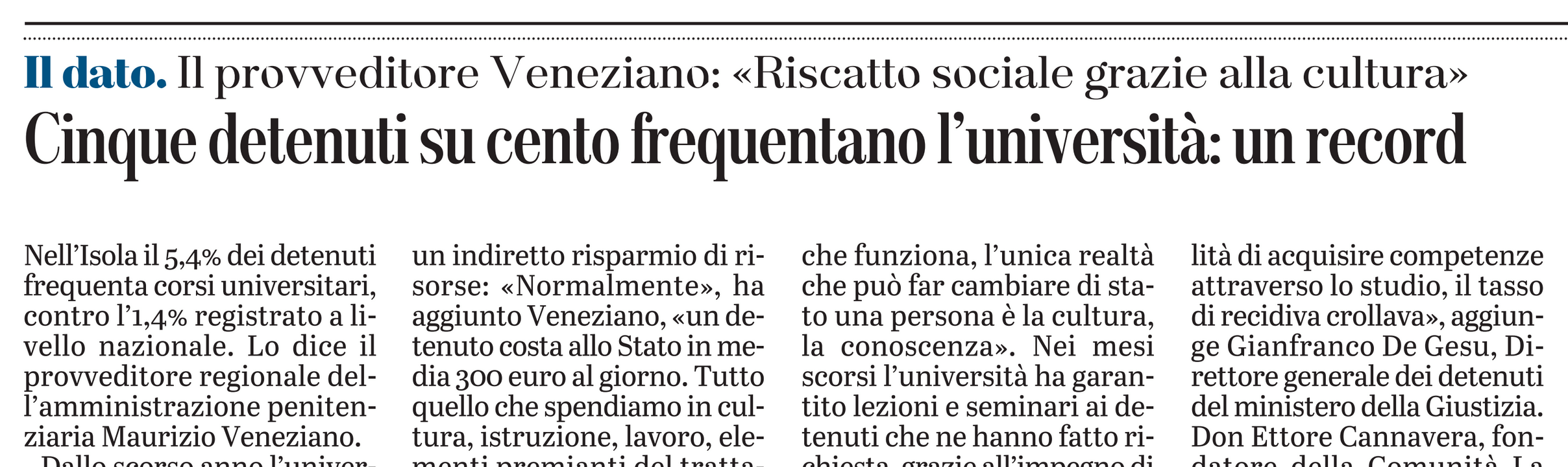 Dallo scorso anno l'università cagliaritana ha attivato un Polo universitario penitenziario che garantisce la frequenza a corsi e seminari ai detenuti e alle detenute negli istituti di Uta e Massama che ne facciano richiesta. Un'attività che genera anche un indiretto risparmio di risorse: «Normalmente», ha aggiunto Veneziano, «un detenuto costa allo Stato in media 300 euro al giorno. Tutto quello che spendiamo in cultura, istruzione, lavoro, elementi premianti del trattamento penitenziario che riducono la recidiva una volta terminata la pena, va a formare un grande valore economico».