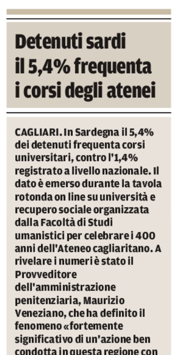 Cagliari, 22 gennaio 2021 - In Sardegna il 5,4% dei detenuti frequenta corsi universitari, contro l’1,4% registrato a livello nazionale. Il dato è emerso ieri sera durante la tavola rotonda on line su università e recupero sociale organizzata dalla Facoltà di Studi umanistici per celebrare i 400 anni dell’Ateneo cagliaritano. A seguirla sui canali social dell’Università del capoluogo più di 200 persone.