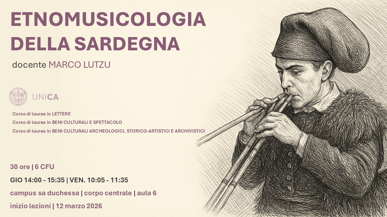 Segnalo alle studentesse e agli studenti che mercoledì 11 marzo 2026 inizierà il corso di ETNOMUSICOLOGIA DELLA SARDEGNA.