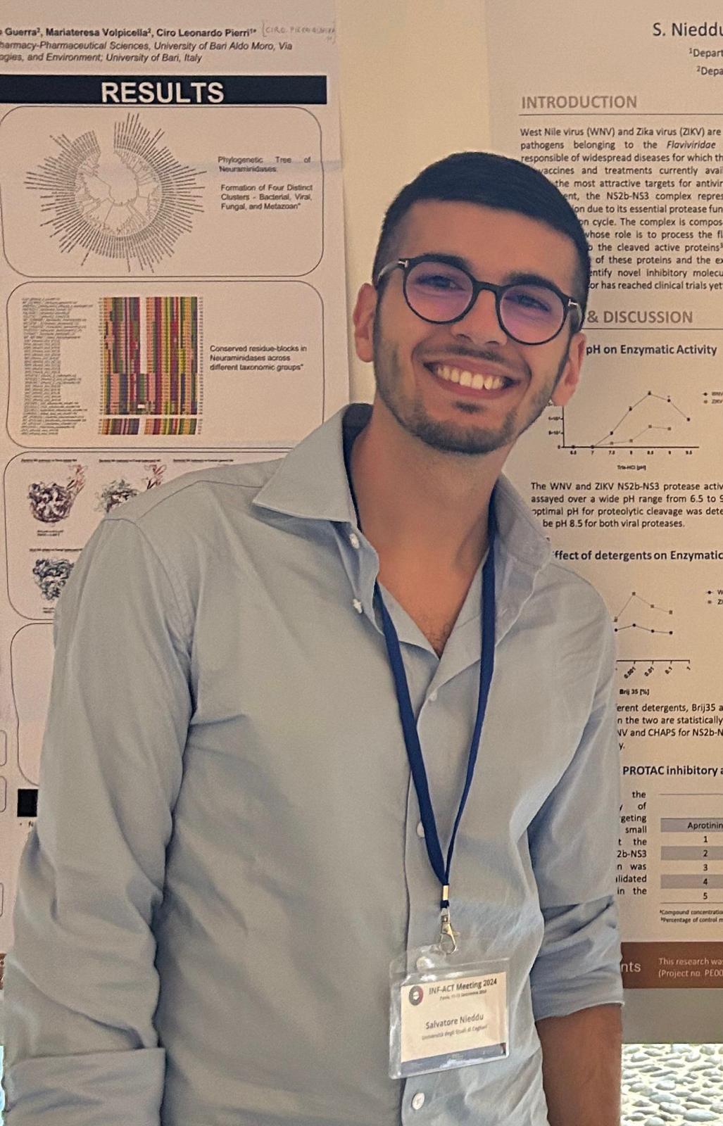 Since October 2023, Salvatore has been a PhD student in the XXXIX Cycle of the PhD Program in Life, Environment and Drug Sciences at the University of Cagliari. Under the supervision of Professor Francesca Esposito, his current research focuses on the identification of novel inhibitors targeting the proteases of flaviviruses. His research activity is supported by periodic scholarship financed by PNRR Extentended Paternship INFACT: One Health Basic and Translational Actions Addressing Unmet Needs on Emerging Infectious Diseases.