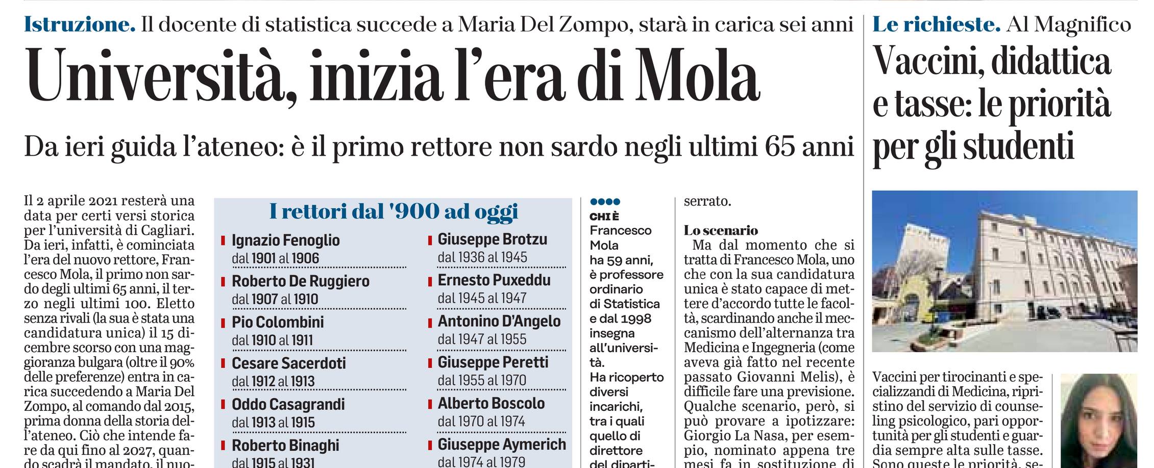 Il 2 aprile 2021 resterà una data per certi versi storica per l'università di Cagliari. Da ieri, infatti, è cominciata l'era del nuovo rettore, Francesco Mola, il primo non sardo degli ultimi 65 anni, il terzo negli ultimi 100. Eletto senza rivali (la sua è stata una candidatura unica) il 15 dicembre scorso con una maggioranza bulgara (oltre il 90% delle preferenze) entra in carica succedendo a Maria Del Zompo, al comando dal 2015, prima donna della storia dell'ateneo. Ciò che intende fare da qui fino al 2027, quando scadrà il mandato, il nuovo rettore lo ha già messo nero su bianco nel programma elettorale di 36 pagine e ribadito qualche tempo fa in un'intervista all'Unione Sarda. Rivolgendosi indirettamente a docenti e ricercatori dell'ateneo, disse che «il nostro è un ruolo di servizio e credo che ci debba essere continuità con le cose fatte bene e abbandonare ciò che non ha funzionato», mentre agli studenti disse che «l'obiettivo è rendere sempre meno pesante il ruolo del contributo studentesco e incrementare quantità e qualità degli esoneri continuando a premiare anche il merito».