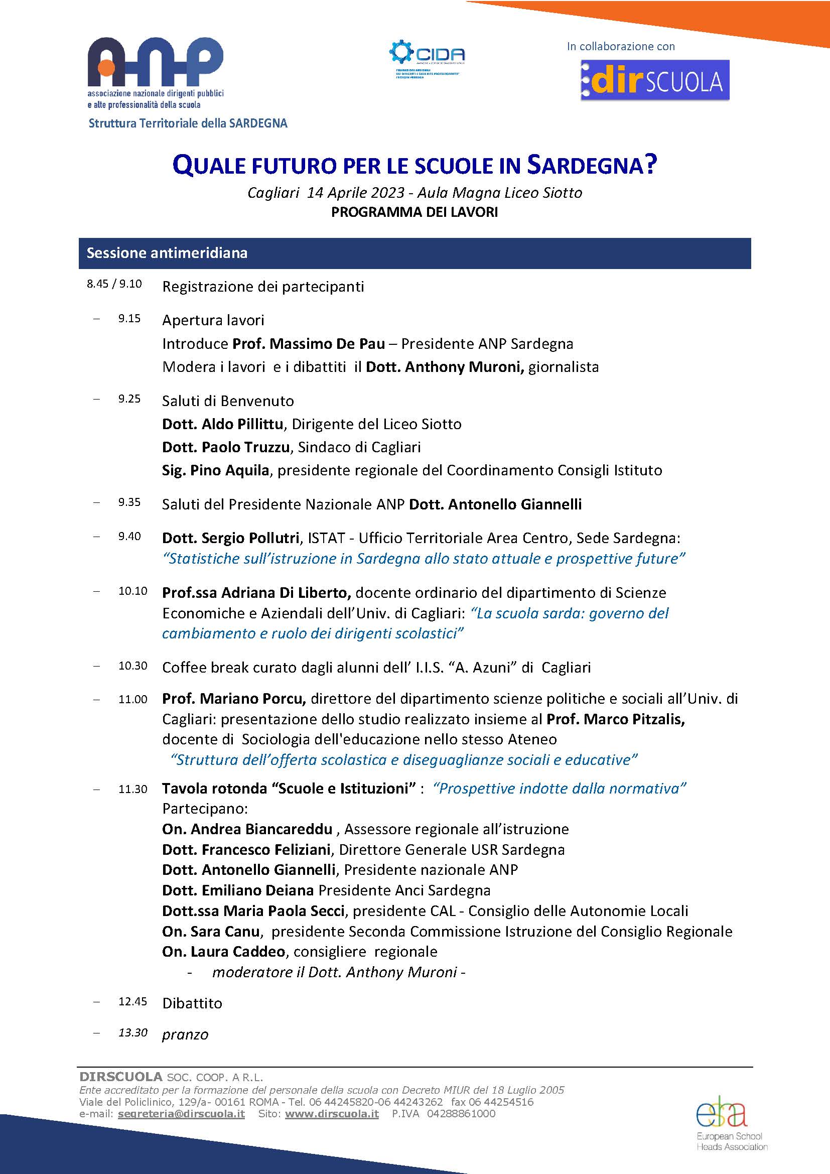 Alle ore 10:10 la Prof.ssa Adriana Di Liberto, docente ordinario del dipartimento di Scienze Economiche e Aziendali dell'Univ. di Cagliari terrà un intervento su: "La scuola sarda: governo del cambiamento e ruolo dei dirigenti scolastici"