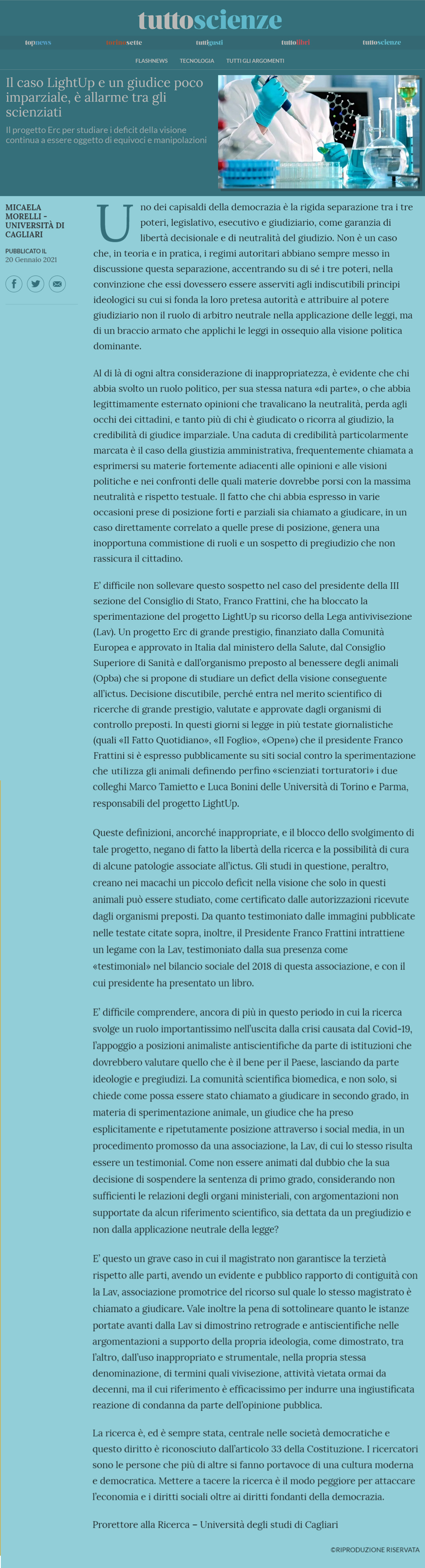 Nell'articolo si sottolinea lo stop amministrativo a “Un progetto Erc di grande prestigio, finanziato dalla Comunità Europea e approvato in Italia da ministero Salute, Consiglio superiore di sanità e organismo preposto al benessere degli animali (Opba) che si propone di studiare un deficit della visione conseguente all’Ictus. Decisione discutibile perché entra nel merito scientifico di ricerche valutate e approvate dagli organismi di controllo (...) Si legge in più testate giornalistiche (Il Fatto Quotidiano, Il Foglio, Open) che il presidente Franco Frattini si è espresso su siti social contro la sperimentazione che utilizza gli animali definendo perfino “scienziati torturatori” i due colleghi Marco Tamietto e Luca Bonini delle Università di Torino e Parma, responsabili del progetto LightUp. Queste definizioni inappropriate, e il blocco dello svolgimento del progetto, negano - rimarca la professoressa Morelli - la libertà della ricerca e la possibilità di cura di alcune patologie associate all’ictus. Gli studi creano nei macachi un piccolo deficit nella visione che solo in questi animali può essere studiato, come certificato dalle autorizzazioni degli organismi preposti. Da quanto testimoniato dalle immagini pubblicate nelle varie testate il presidente Frattini intrattiene un legame con la Lav testimoniato dalla sua presenza come “testimonial” nel bilancio sociale del 2018 dell’associazione”.