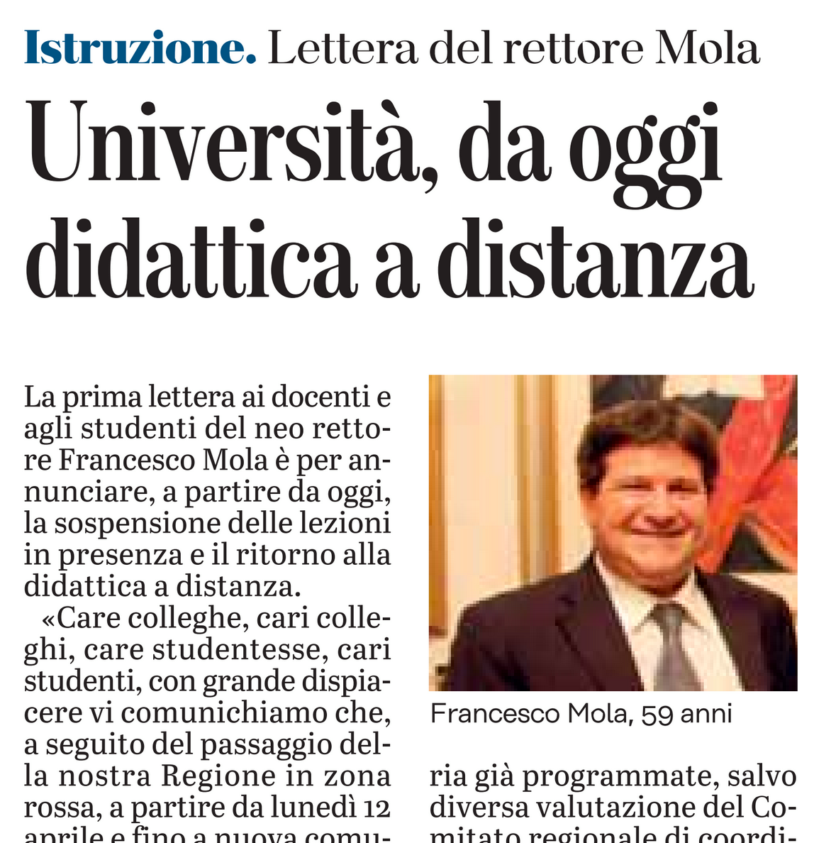 La prima lettera ai docenti e agli studenti del neo rettore Francesco Mola è per annunciare, a partire da oggi, la sospensione delle lezioni in presenza e il ritorno alla didattica a distanza.