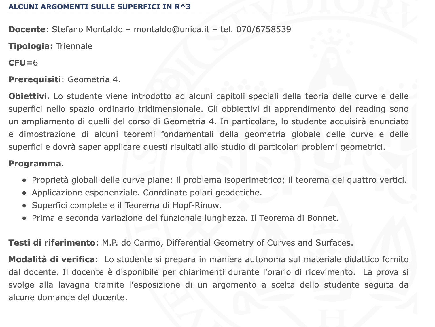 Testi di riferimento: M.P. do Carmo, Differential Geometry of Curves and Surfaces.