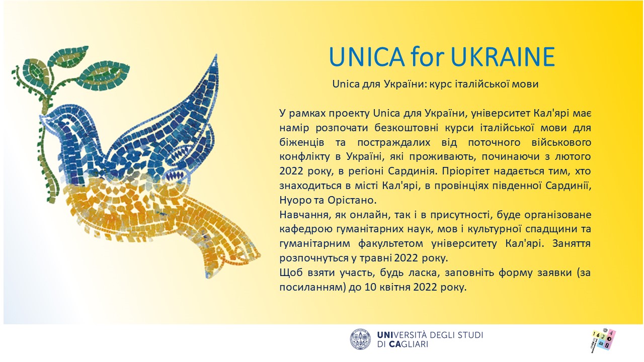 Nell'ambito del progetto Unica per l’Ucraina, l’Università degli Studi di Cagliari intende promuovere dei corsi gratuiti di lingua italiana per i rifugiati, vittime dell’attuale conflitto in Ucraina, che soggiornano, a partire dal mese di febbraio 2022, nella regione Sardegna. La priorità sarà riservata a coloro che si trovano nella città metropolitana di Cagliari, nelle province del Sud Sardegna, di Nuoro e di Oristano.
