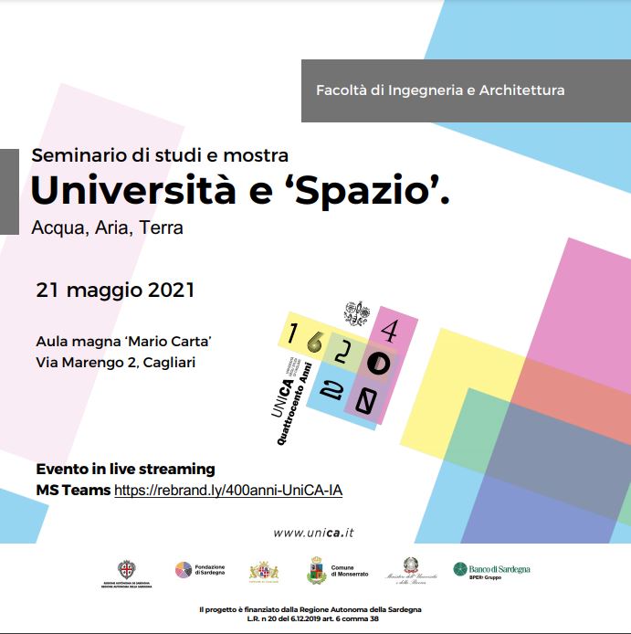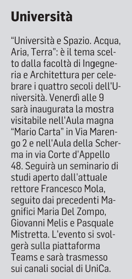 "Università e Spazio. Acqua, Aria, Terra": è il tema scelto dalla facoltà di Ingegneria e Architettura per celebrare i quattro secoli dell'Università. Venerdì alle 9 sarà inaugurata la mostra visitabile nell'Aula magna "Mario Carta" in Via Marengo 2 e nell'Aula della Scherma in via Corte d'Appello 48. Seguirà un seminario di studi aperto dall'attuale rettore Francesco Mola, seguito dai precedenti Magnifici Maria Del Zompo, Giovanni Melis e Pasquale Mistretta. L'evento si svolgerà sulla piattaforma Teams e sarà trasmesso sui canali social di UniCa.