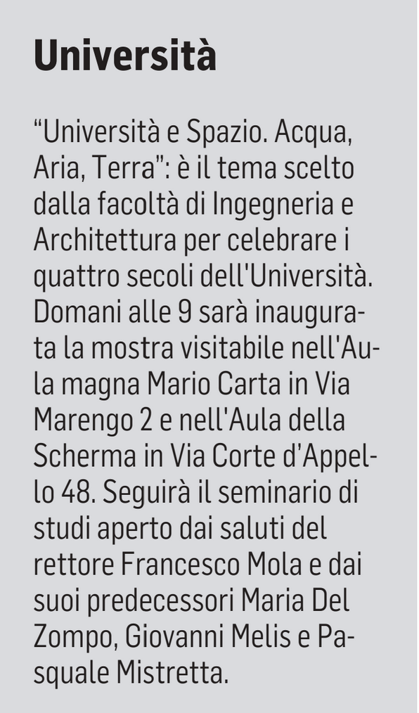 "Università e Spazio. Acqua, Aria, Terra": è il tema scelto dalla facoltà di Ingegneria e Architettura per celebrare i quattro secoli dell'Università. Domani alle 9 sarà inaugurata la mostra visitabile nell'Aula magna Mario Carta in Via Marengo 2 e nell'Aula della Scherma in Via Corte d'Appello 48. Seguirà il seminario di studi aperto dai saluti del rettore Francesco Mola e dai suoi predecessori Maria Del Zompo, Giovanni Melis e Pasquale Mistretta.