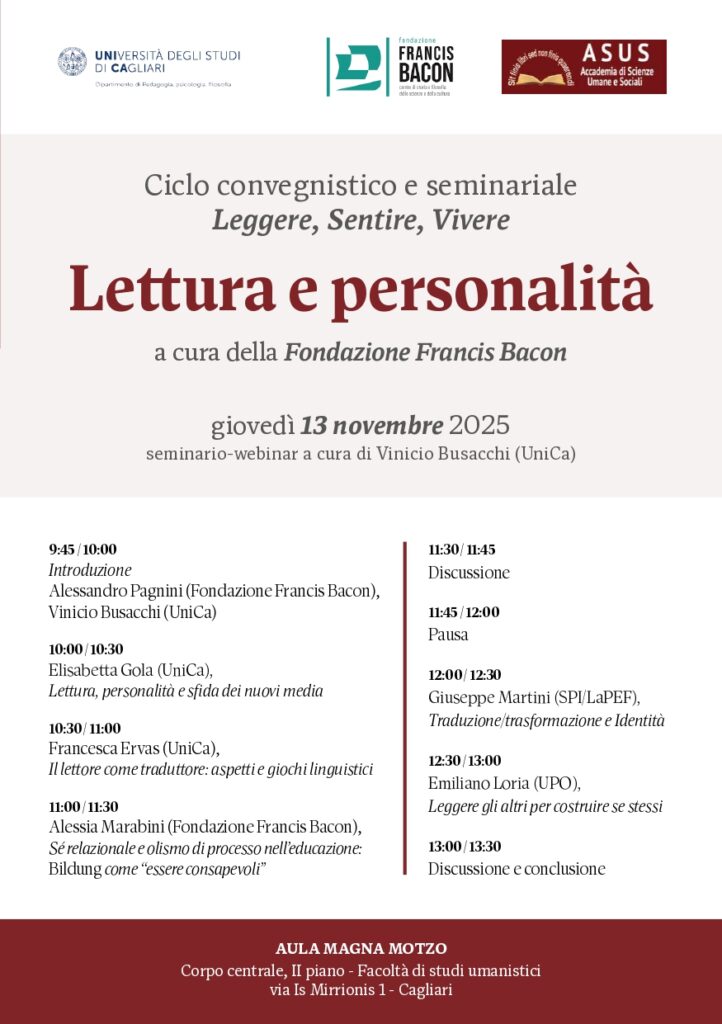 Seminario-webinar “LETTURA E PERSONALITÀ” curato dalla Fondazione Francis Bacon in collaborazione con il Dipartimento di Pedagogia, Psicologia, Filosofia dell’Università di Cagliari e l’ASUS - Accademia di Scienze Umane e Sociali (Roma).
